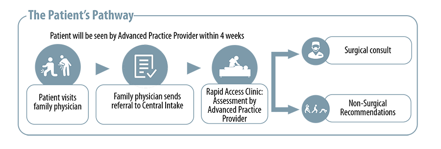 The Hip and Knee Rapid Access Clinics were launched on November 1, 2018 to support patients with moderate to severe hip or knee arthritis. The program provides patients with a standardized assessment by an Advanced Practice Provider within 4 weeks of the referral to determine the appropriate path tailored to the patient’s needs including non-surgical management and/or surgical consultation. To refer to this program, please complete all sections of this referral form and fax to 1-833-230-6623.